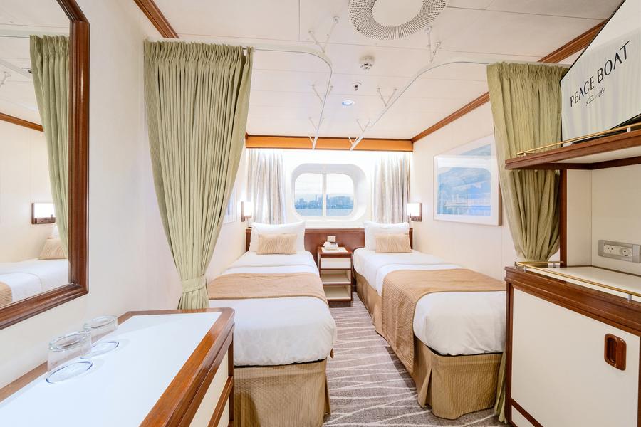 *友好型(三人一室/四人一室):此房型為上下舖的型態(兩張下舖床+1~2張上舖床),您可以加價指定下舖床位,需支付下舖指定費23,000元(有上舖床位)/45,000元(無上舖床位),和平船會在出發前通知是否指定成功,確認指定成功才會加收此費用。友好型室友皆由船公司隨機安排,無法指定。但若自行找滿三人或四人除外。考量長程航行期間之安全與健康狀況,75 歲以上旅客恕無法適用友好型艙房方案。