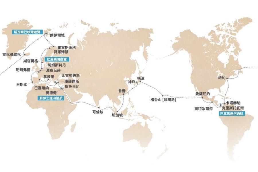 此航程24個驚艷港口:香港(中國)、新加坡、可倫坡(斯里蘭卡)、塞得港(埃及)、庫薩達斯(土耳其)、聖托里尼(希臘)、比雷埃夫斯(希臘)、拿坡里(義大利)、巴塞隆納(西班牙)、里斯本(葡萄牙)、勒阿弗爾(法國)、澤布呂赫(比利時)、阿姆斯特丹(荷蘭)、斯塔萬格(挪威)、特羅姆瑟(挪威)、霍寧斯沃格(挪威)、朗伊爾城(挪威 斯瓦爾巴群島)、雷克雅維克(冰島)、紐約(美國)、卡塔赫納(哥倫比亞)、克里斯托瓦爾(巴拿馬)、誇特紮爾港(瓜地馬拉)、曼薩尼約(墨西哥)、歐胡島檀香山(美國夏威夷)