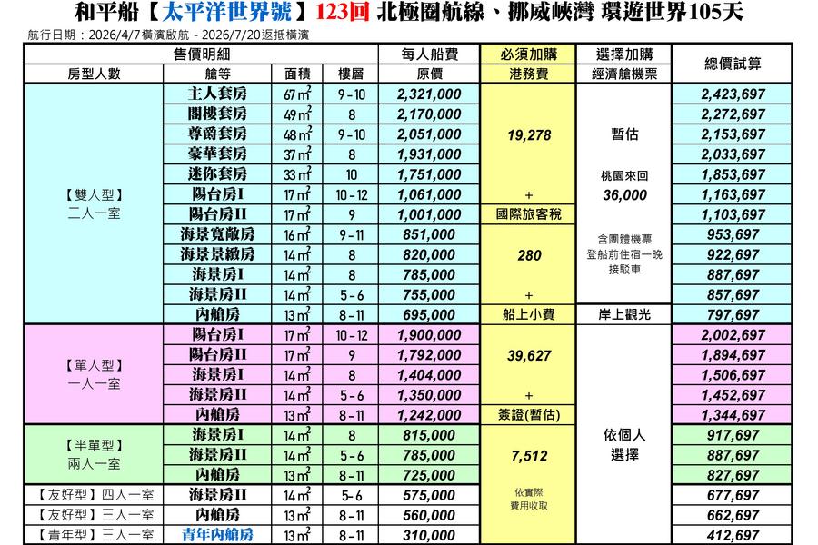 *青年內艙房:限以出航日計算未滿30歲之青年報名。